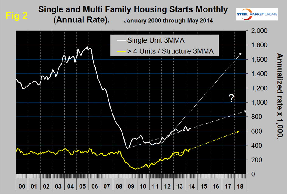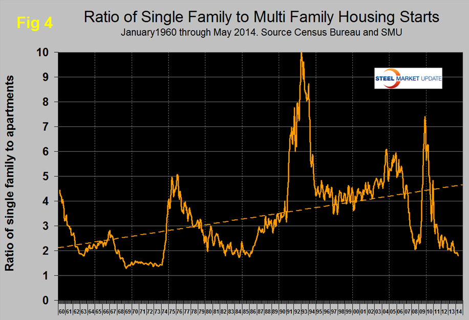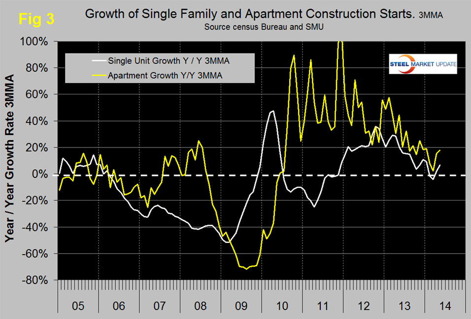 SMU Comment: Even though the steel content of housing is only a small proportion of total steel consumption, housing is a leading indicator of many construction sectors such as non-residential and sub sectors of infrastructure and has a large multiplier effect in the economy as a whole. To the extent that readers businesses are influenced by the relative size of the two housing sectors they should plan for further continued growth of apartment construction and a single family sector that continues to struggle.