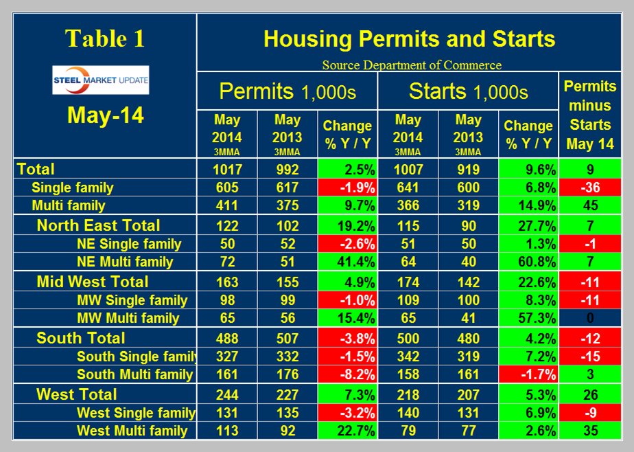 Permit data is useful to evaluate where future starts are headed. If permits exceed starts then we anticipate an acceleration and vice versa. Table 1 shows that total permits did exceeded starts by 9,000 in May on a 3MMA basis.