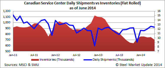 Canadian shipments for all steel products in the month of May were 509,700 net tons, an increase of 2.7 percent from the month before, but a decrease of 1.0 percent from May 2013. Inventories at the end of the month stood at 1,384,900 tons, down 3.3 percent from last month and down 9.0 percent from the same month one year ago. The daily average receipt rate for May was 22,097 tons (21 day month), up from 21,682 tons the month before (21 day month). Total May receipts were 6,800 tons higher than the April figure. According to the MSCI, total months on hand stood at 2.7 months.