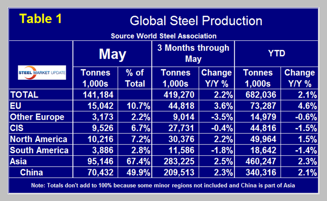 Capacity is now 2.076 billion tonnes. Table 1 shows regional production in the single month of May with regional share of the global total, also three months production through May and YTD production.