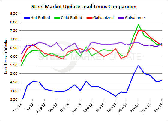 Cold rolled lead times average 6.70 weeks, again about the same as earlier this month and well above the 5.46 weeks reported one year ago. The 6.70 weeks is about one week shorter than what we were seeing out of our survey during the months of April and May.