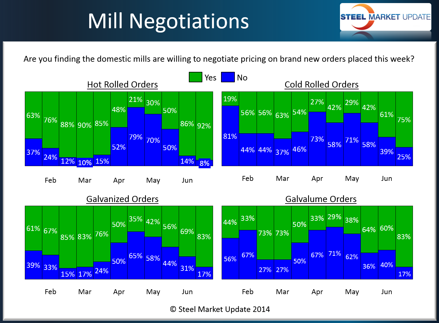 When looking at hot rolled the percentage of respondents reporting mills as willing to negotiate pricing rose from 86 percent at the beginning of June to 92 percent this past week.