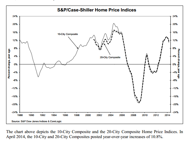Home prices on an annual basis slowed more than expected in April according to the S&P/Case Shiller Home Price Indices. Indices for both the 10 and 20-city composites showed an annual gain of 10.8 percent, down from 12.4 percent in March and lower than economist expectations of 11.4 percent. Annual gains were lower in 19 of the 20 cities when compared to March, down by approximately three percent.