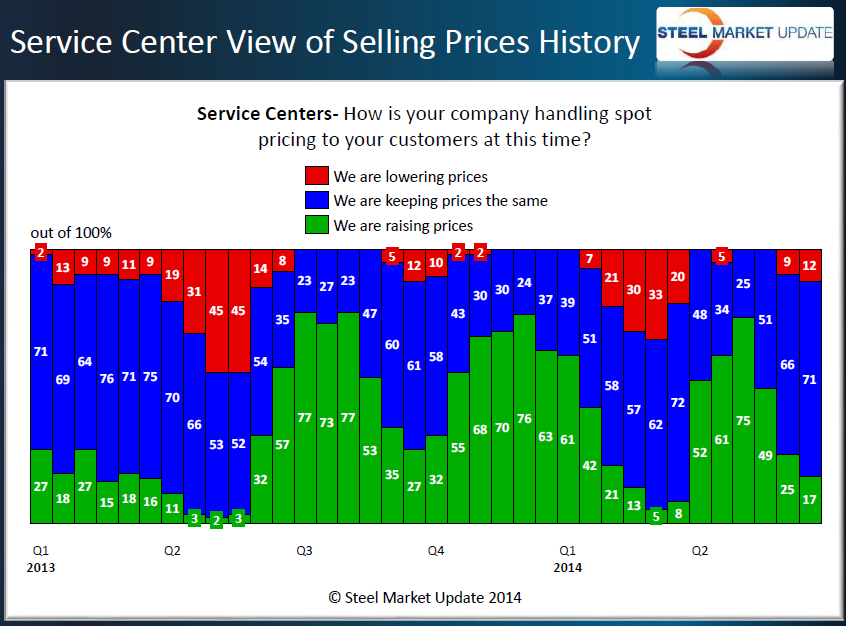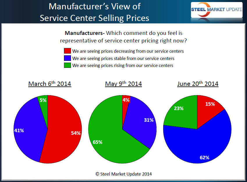 We are now seeing a 2 percentage point increase to 23 percent of the manufacturing respondents reporting service center prices as increasing. However, prior to early June we had a month and a half where the majority of respondents were reporting higher prices.