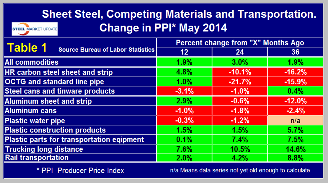 What the PPI data shows is that the acceleration in commodity prices slowed to 1.9 percent in 12months through May from 3.0 percent in 24 months through May. Both hot rolled carbon sheet and strip and OCTG reversed course in a positive direction in May. The price of steel cans and tin-ware products made some competitive progress against aluminum cans in the last 12 months after years of declining competitiveness. Steel has become more competitive against plastic piping, construction products and construction equipment parts in the last 24 and 36 months.