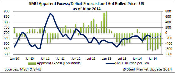 Last week, while we were in New York City for various steel conferences, the Metal Service Center Institute (MSCI) published steel inventory and steel shipment data for the month of May. Based on this information and a special analysis of the data by Steel Market Update we produce our SMU Apparent Excess or Deficit of the U.S. steel service center flat rolled steel inventories. This is normally a product we reserve for our Premium Level members but we thought our Executive Level members would also find this analysis of interest.