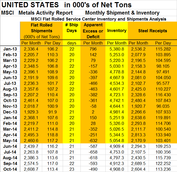 As we move into the June through October, Steel Market Update is projecting a continuation of the negative steel inventories at the service center level even though we are forecasting shipments to be up 6 percent year-over-year. We are projecting inventories will remain negative by approximately 500,000 tons each month through October 2014. This would be good news for the domestic steel mills.