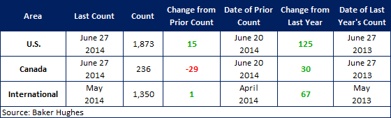 According to Baker Hughes data from June 27th, 2014, the U.S rig count for this week is 1,873 rigs exploring for or developing oil or natural gas. This count is an increase of 15 rigs when compared to last week, with oil rigs up 13 to 1,558 rigs, gas rigs up 3 to 314 rigs, and miscellaneous rigs down 1 to 1 rig. Compared to last year the 1,873 count is an increase of 125 rigs, with oil rigs up by 168, gas rigs down by 39, and miscellaneous rigs down by 4.