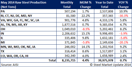 The American Iron & Steel Institute (AISI) reported their final raw steel production numbers for the month of May 2014. This estimation is different than the weekly raw steel production as it is based on 75 percent of the domestic mills reporting vs. 50 percent for the weekly estimates.