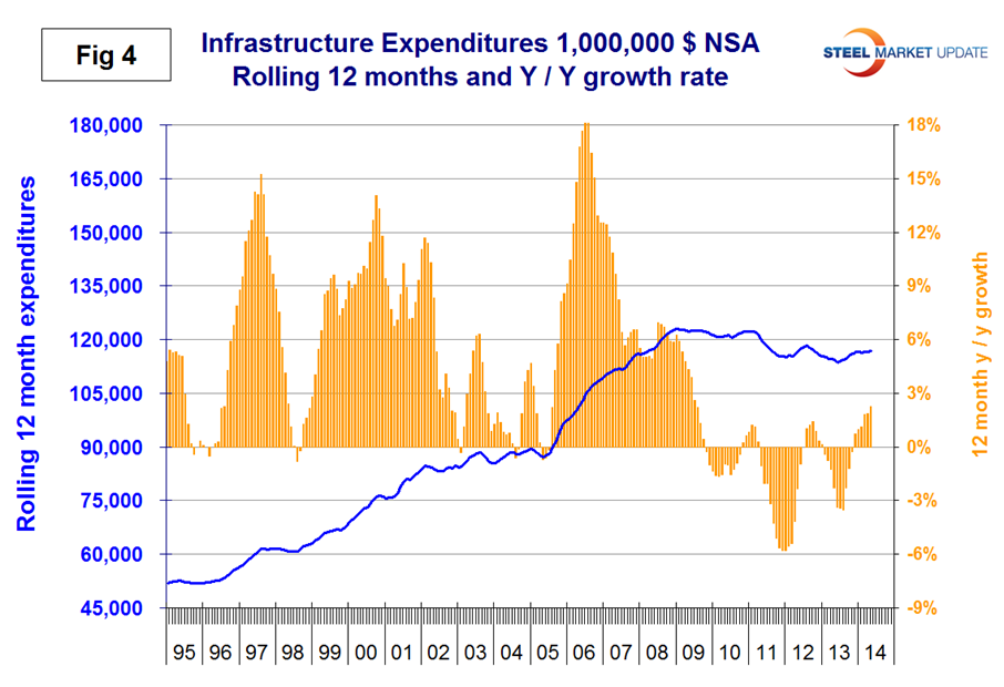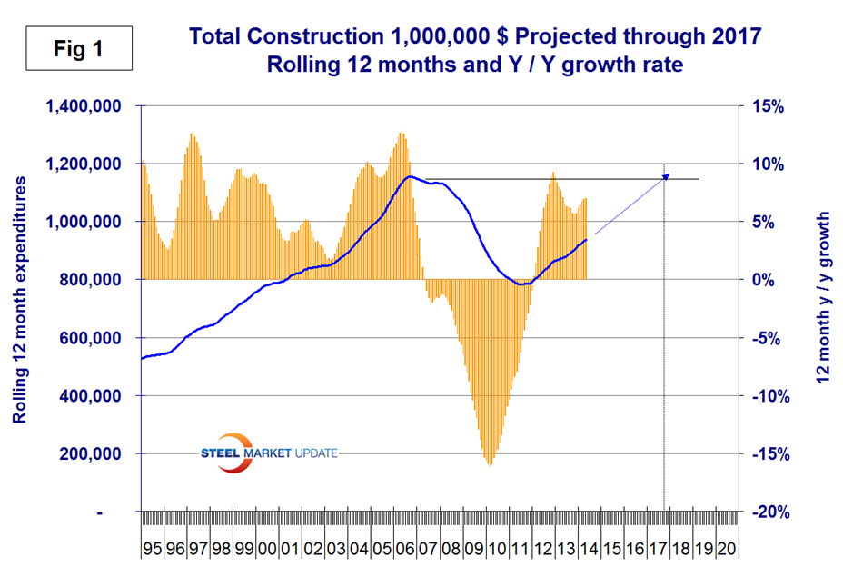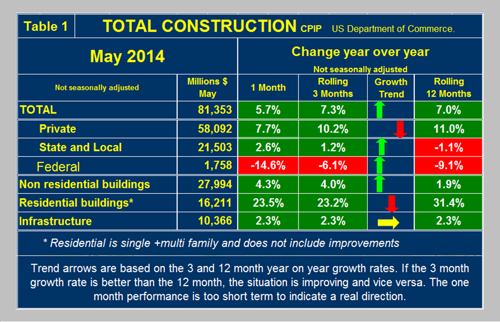 Federal expenditures declined 14.6 percent in May and on a rolling 12 month basis y/y were down by 9.1 percent. The Federal sector is so small as to be of little interest to us as we review the big picture. On a rolling three month basis total construction was up by 7.3 percent y/y and was up by 7.0 percent on a rolling 12 months y/y. This means that total construction growth is accelerating slightly since the short term growth (3 months) is greater than the long term, (12 months). Note this is not a seasonal effect because our y/y analysis removes seasonality. Private work has negative momentum but state and local momentum was positive in the May results. We consider three sectors within total construction. These are non-residential, residential and infrastructure. On a rolling three month basis y/y non-residential is growing at 4.0 percent and accelerating. Residential is growing at 23.2 percent and slowing. Infrastructure grew 2.3 percent y/y and was flat in the last three months compared to the rolling 12 month number. The growth of total construction has been fairly steady for over 18 months but it will be Q3 2017 before the pre recessionary peak is regained, (Figure 1). The pre-recession peak of total construction on a rolling 12 month basis was $1,145 B in 12 months through February 2007. The low point was $768 B in 12 months through May 2011. The 12 month total through the latest data of May 2014 was $938 B. This means that total construction is still only 82 percent of its pre-recession peak.