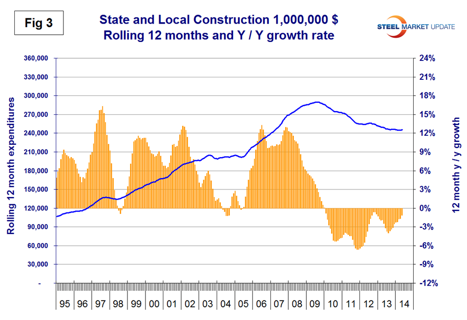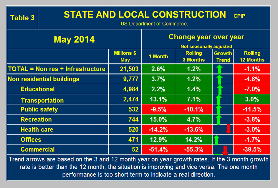 State and Local Construction: S&L work increased by 2.6 percent in the single month of May y/y and the rolling three months also increased by 1.25, (Table 3).