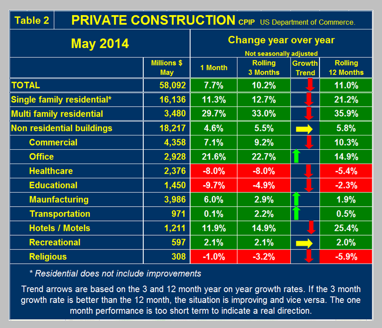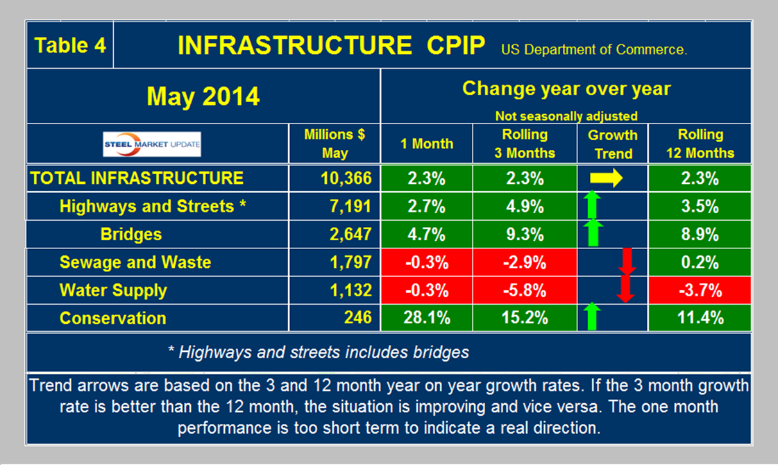 Infrastructure: Expenditures have had positive growth in each of the last nine months through May with a + 2.3 percent result in the latest data. The growth in three months is the same as that in 12 months meaning that momentum is zero as the industry waits for the resolution of the highway trust fund issue. Bridge construction is still strong and accelerating which pushed highways and streets to a 4.9 percent growth in three months, (Table 4).