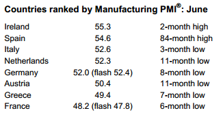 Growth momentum in the Eurozone is beginning to lose steam with both production and new order expanding at slower rates in June. The June Markit Eurozone Manufacturing PMI was down to 51.8 from 52.2 in May.