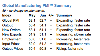 The JP Morgan Global Manufacturing PMI rose moderately to 52.7 in June from 52.1 in May, an expansion of the manufacturing sector for the 19th month. Production increased at the fastest rate since February due to a flow of new orders. International trade volumes were subdued in June reported JP Morgan and Markit. The June increase was not sufficient to fully recoup lost momentum from earlier in the quarter, according to the report.
