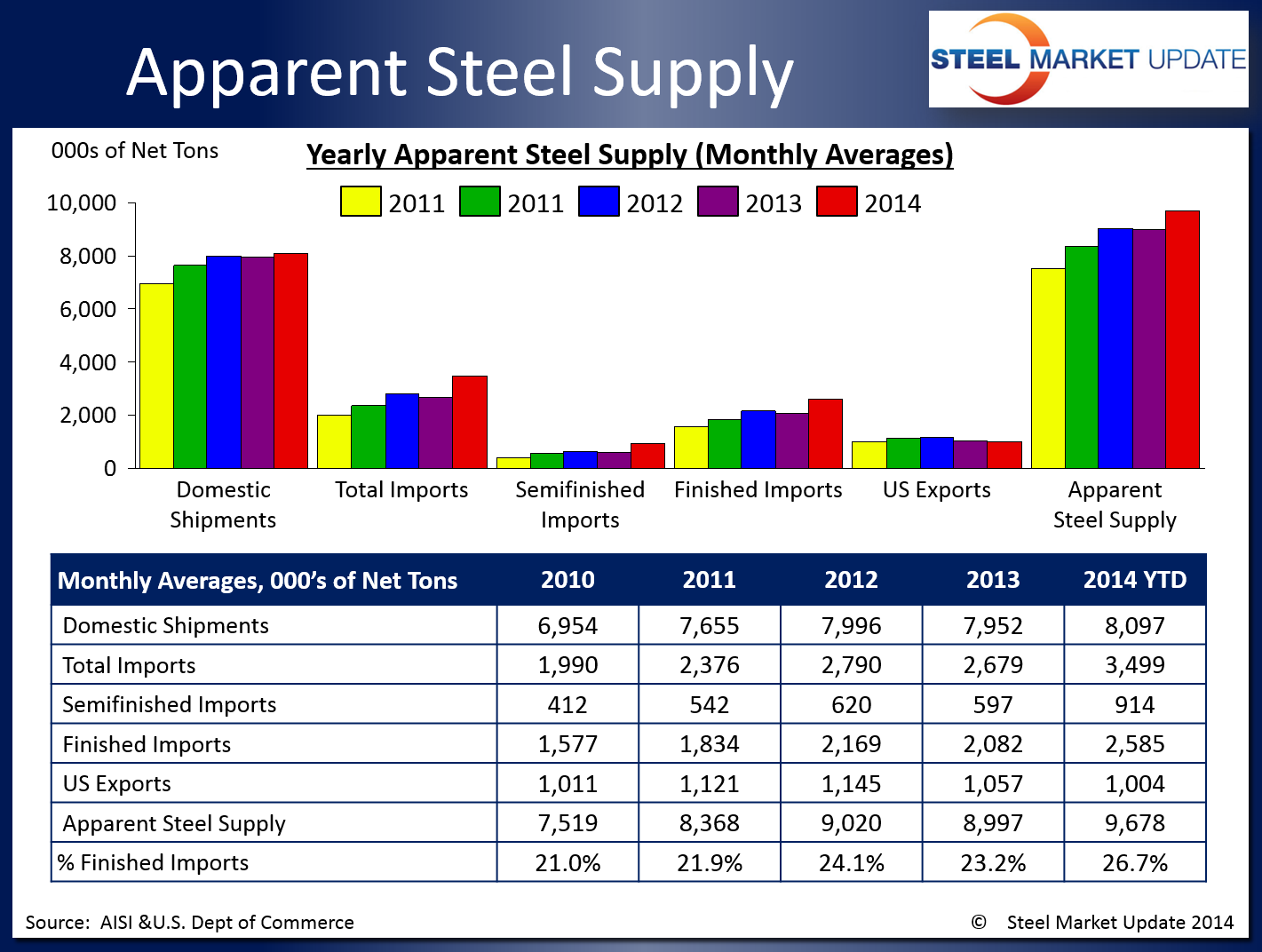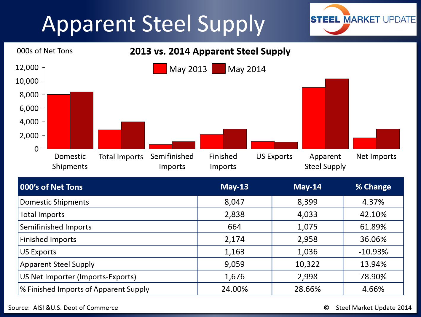 Apparent steel supply for May was 10,321,747 net tons, the highest figure Steel Market Update has in its recorded history back to January 2010 (by no means a historical record). Steel Market Update calculates apparent steel supply by adding domestic shipments and finished US imports and subtracting total US exports. May supply represents a 1,262,877 ton or 13.9 percent increase compared to the same month one year ago. This is primarily due to the massive spike in 2014 imports, with final May imports up 42.1 percent or 1,195,058 net tons over May 2013 tonnage. Domestic shipments and finished imports also increased over levels one year prior, while exports decreased. The net trade balance between imports and exports was a surplus of 2,997,743 tons in May, an increase of 78.9 percent from the same month last year, and also the highest figure in our 4+ year recorded history.