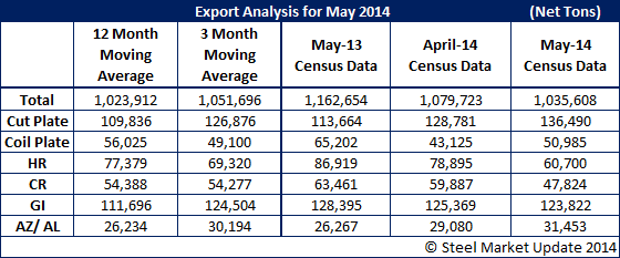 Exports of plate cut lengths were 136,490 tons, up 6.0 percent over April and up 20.1 percent over the same month one year ago. Plates in coils increased 18.2 percent over April to 50,985 tons but were down 21.8 percent over May 2013 exports.