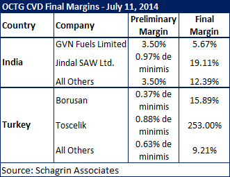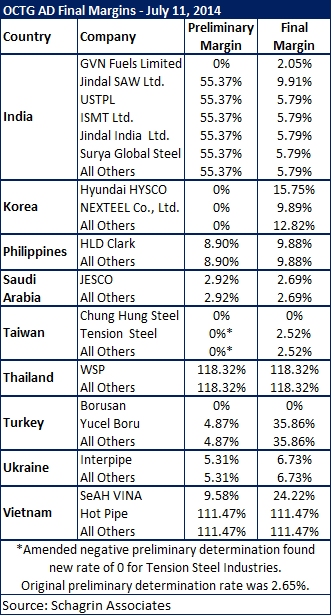 The International Trade Commission and Commerce Department issued the following determination on antidumping relief on OCTG imports from South Korean steelmakers: