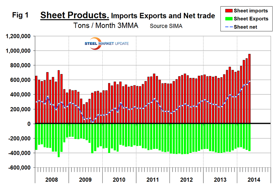 The supply of all steel products in the 3 months March through May 2014 was up by 10.0 percent from the same period last year. Flat rolled was up by 11.6 percent and sheet products by 11.5 percent. The sources of this analysis are the Commerce Department trade statistics and AISI steel shipment data.