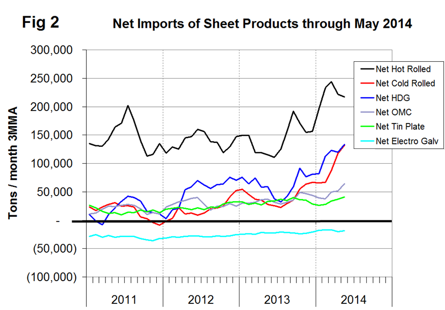 Table 1 shows net imports by product. Year to date through May, total flat rolled net imports were 3,619,056 tons of which 2,998,795 tons were sheet products. Net sheet imports more than doubled y/y being up by 1,654,837 tons. Net imports increased on all products except rail, led by hot band which increased by 616,783 tons. Electro-galvanized was the only product to have a trade surplus in 2013 and 2014 year to date but this surplus declined in 2014.In Table 1 negative net imports, (which means a trade surplus) are shown in green.