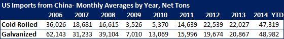 With galvanized we get similar results although, as an average, 2014 monthly exports to the USA have not yet exceeded the 2006 levels. They have, however, exceeded all of the other years shown on our table. In May the Chinese mills exported 80,224 net tons beating out Canada as our biggest supplier of GI.