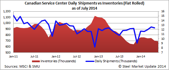 Canadian shipments for all steel products in the month of June were 481,000 net tons, a decrease of 5.6 percent from the month before, but an increase of 6.0 percent from June 2013. Inventories at the end of the month stood at 1,391,100 tons, up 0.4 percent from last month but down 6.3 percent from the same month one year ago. The daily average receipt rate for June was 23,171 tons (21 day month), up from 22,097 tons the month before (21 day month). Total June receipts were 24,400 tons higher than the May figure. According to the MSCI, total months on hand stood at 2.9 months on an unadjusted and seasonally-adjusted basis.