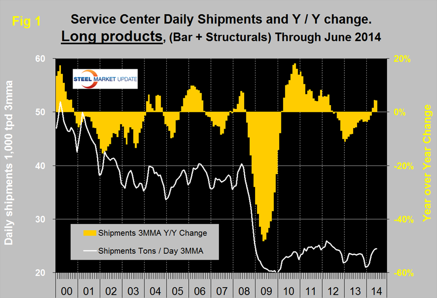 There continues to be a wide difference between the performances of flat rolled (sheet + plate) and long products, (structurals + bar) at the service center level. Long products have had a very poor recovery from the recession and on a 3MMA basis y/y, April, May and June were the first months of positive year/year growth after 21 straight months of decline, (Figure 1).