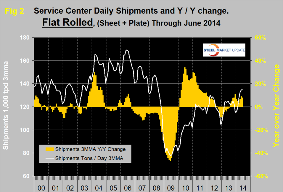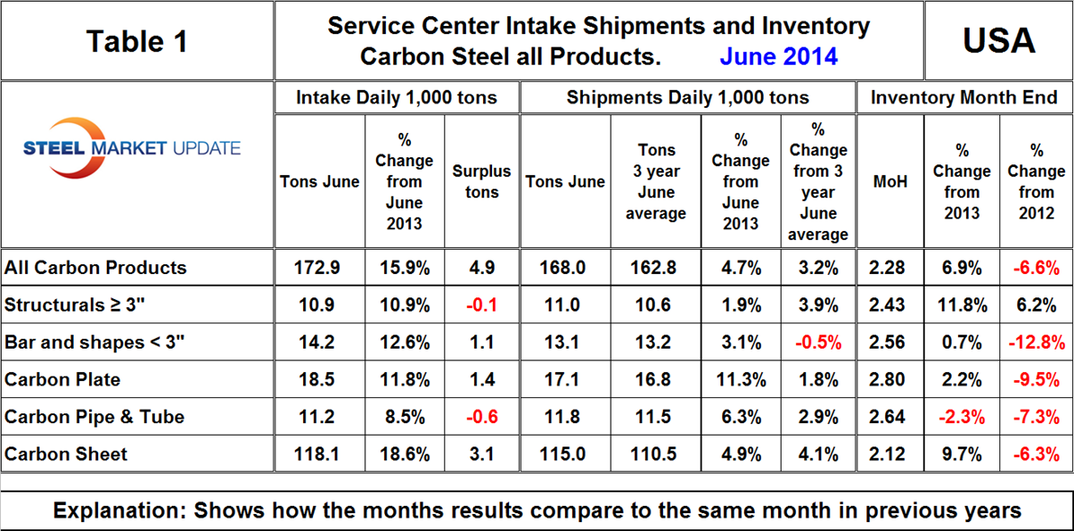 This month we have modified Table 1 to try to present a clearer picture of service center activity. It seems to us as we work with many data sources that a completely different picture can be presented depending on how the numbers are sliced and diced. MSCI data certainly falls into this category. Comparing a month’s performance with the previous month is frequently misleading because of seasonal effects. In past versions of Table 1 we compared a single month’s performance with the same month, one, two and three years ago which we have decided was overly cumbersome. In this latest revision we have compared June shipments on a t/d basis with the average t/d for June 2014, June 2013 and June 2012. We then calculate the percent change between June 2014 and June 2013 and with the 3 year June average. We hope this give the best possible view of market direction. Shipments of all products on a t/d basis were up by 4.7 from June last year and up by 3.2 percent from the average June shipments for 2014, 2013 and 2012. The fact that the single month comparison has a greater improvement than the three year comparison leads us to the conclusion that the improvement is accelerating. This is particularly true of plate. Structurals were the only product that slowed on this basis. Sheet products were up by 4.9 percent year over year and by 4.1 percent in the three year comparison.