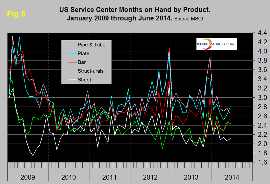 Compared to the end of June last year, moth end inventories were up by 6.9 percent in total, with structurals once again leading with an 11.8 percent increase. There has been quite a bit of optimism recently about the prospects for nonresidential construction and service centers seem to be responding accordingly. Sheet product inventories were up by 9.7 percent year over year but MoH only reached 2.12 at month end.