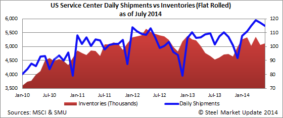 The daily shipment rate dropped from 117,200 tons per day in May to 115,000 tons per day during June. Last year service centers shipped 109,600 tons of flat rolled on a daily basis.