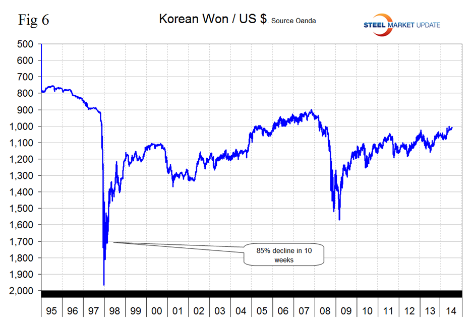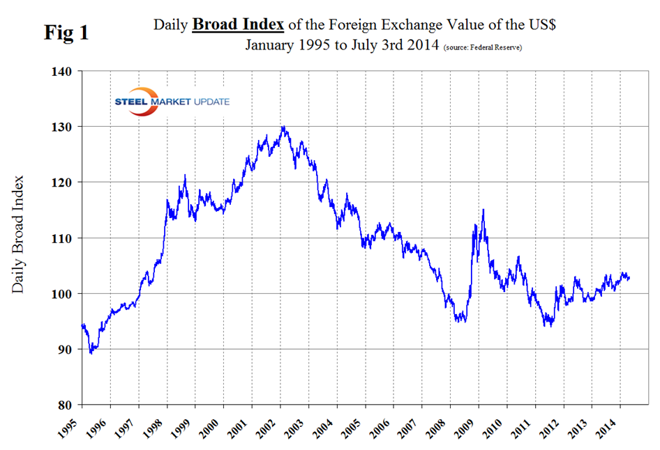 At SMU we use the historical exchange rates published in the Oanda Forex trading platform to track the currency value of the US $ against that of sixteen steel trading nations. Oanda operates within the guidelines of six major regulatory authorities around the world and provides access to over 70 currency pairs. Approximately $4 trillion US $ are traded every day on foreign exchange markets. The Broad Index value of the US $ has been gradually strengthening for almost two years, (Figure 1), and is up by 3.4 percent since the end of 2012. Since mid-2011, the dollar has strengthened by 7.7 percent. This favors imports to the US and depresses exports. The currencies of the steel trading nations do not necessarily follow the broad index and in fact as a generalization can sometimes move in the opposite direction.