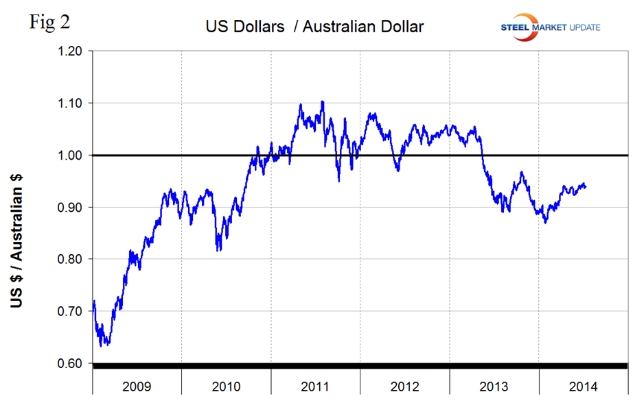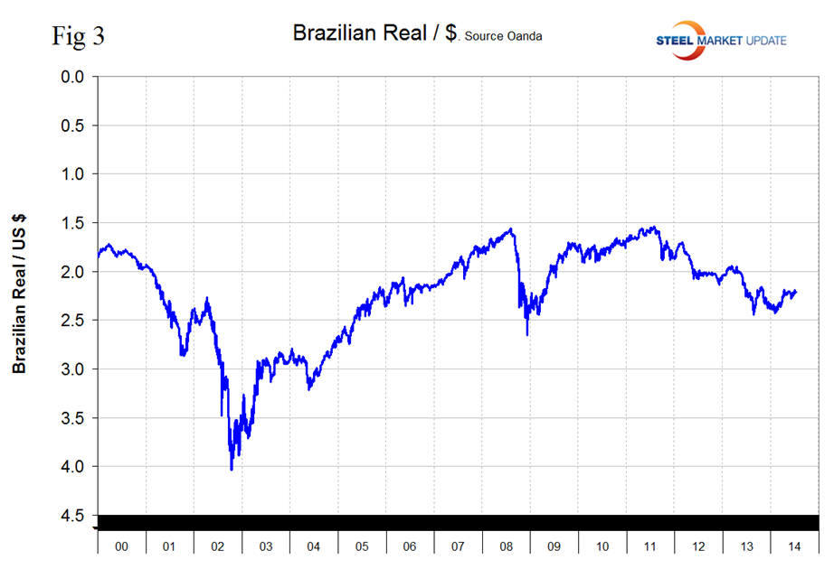 There has been a general weakening of the currencies of the major iron ore producing nations, Australia and Brazil, since mid-2011 but both have strengthened in the course of 2014, (Figure 2 and Figure 3). An increase in these currencies tends to support the global price of iron ore which is traded in US dollars.