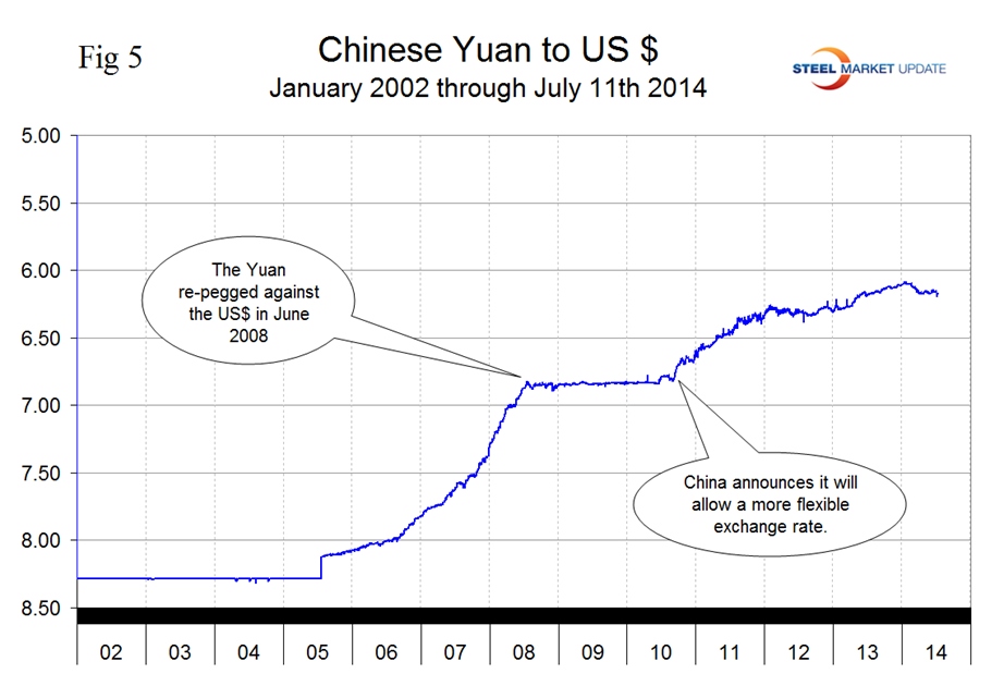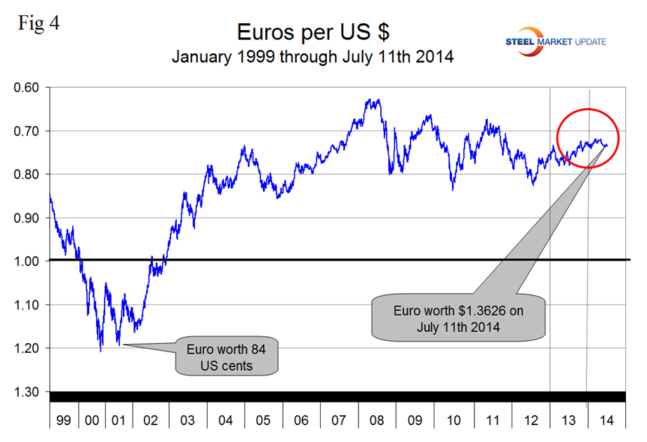 The Euro stood at 1.3626 on July 11th almost unchanged since our last report.The Euro has strengthened steadily for two years and by 6.3 percent against the US $ in the last twelve months, (Figure 4). A strengthening Euro makes US scrap more attractive to Turkish buyers than alternative sources in Europe and tends to suppress European steel exports to the US.