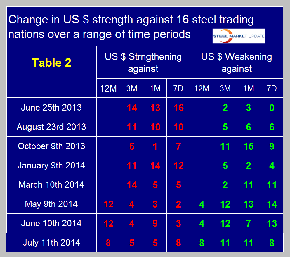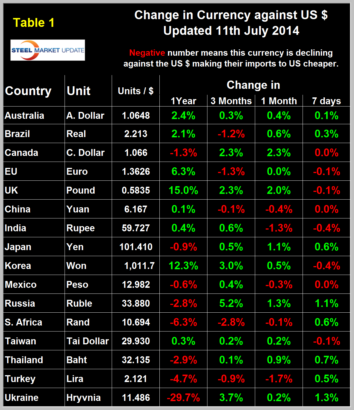 The overall picture for the steel trading nations is that in the last year the US $ has strengthened against eight of the currencies of the major sixteen steel trading nations and weakened against eight also. Table 1 is color coded to indicate strengthening of the foreign currency in green and weakening in red. We regard strengthening of the US Dollar as negative and weakening as positive because the effect on net imports. The biggest change in the last 30 days has been a 2.3 percent strengthening of the Canadian dollar to 1.066 to the US $ on July 11th. In the last month the US $ has weakened against eleven of the currencies of steel trading nations.