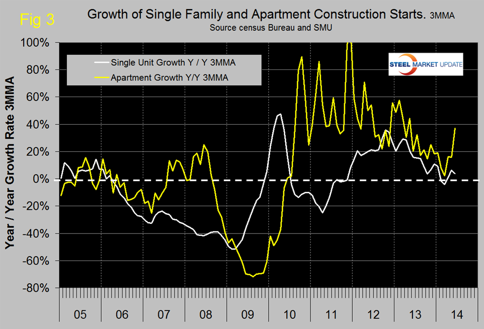 SMU Comment: Even though the steel content of housing is only a small proportion of total steel consumption, housing is a leading indicator of many construction sectors such as non-residential and sub sectors of infrastructure and has a large multiplier effect in the economy as a whole. To the extent that readers businesses are influenced by the relative size of the two housing sectors they should plan for further continued growth of apartment construction and a single family sector that continues to struggle.