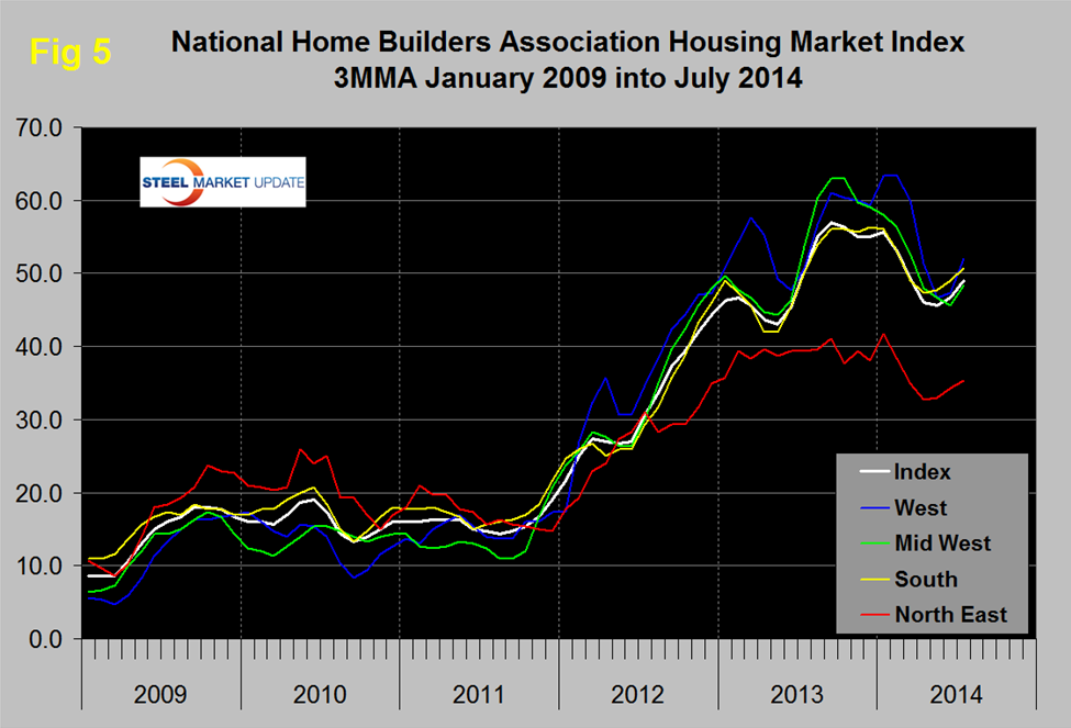 The National Association of Home Builders confidence report released last week exceeded economists’ expectations with a gain of six points to 53, (Figure 5). Any value above 50 indicates an overall positive business confidence.
