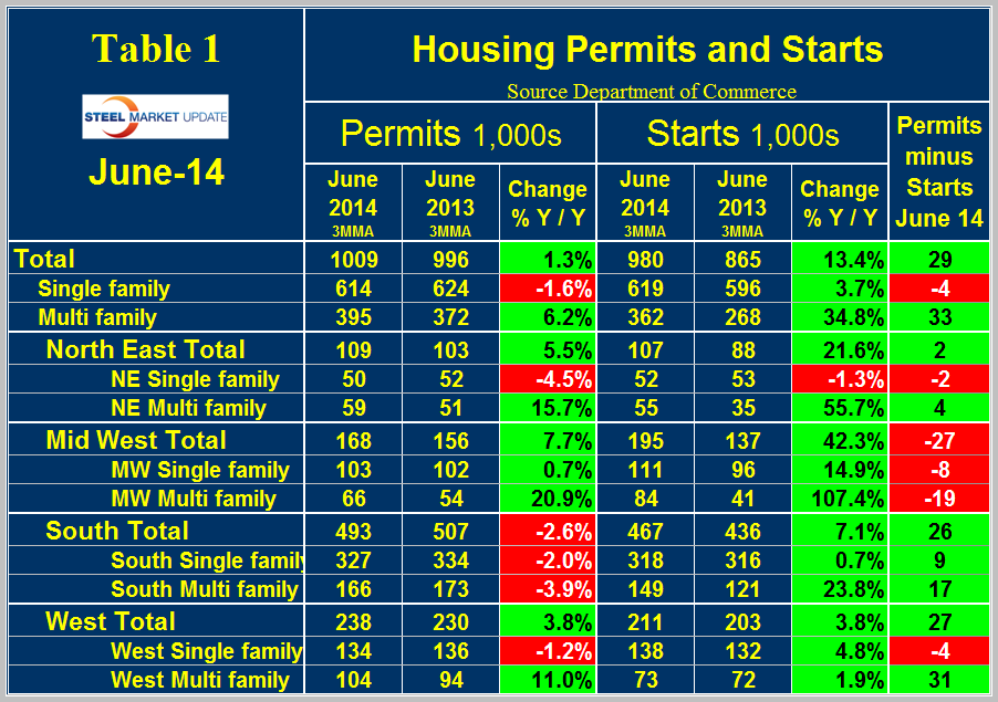 The situation in the four regions reported in the census Bureau report were not a mirror of that at the national level in June. The Mid-West had a y/y growth in total starts of 42.3 percent and starts exceeded permits. Permits in the South for both single and multifamily units declined.