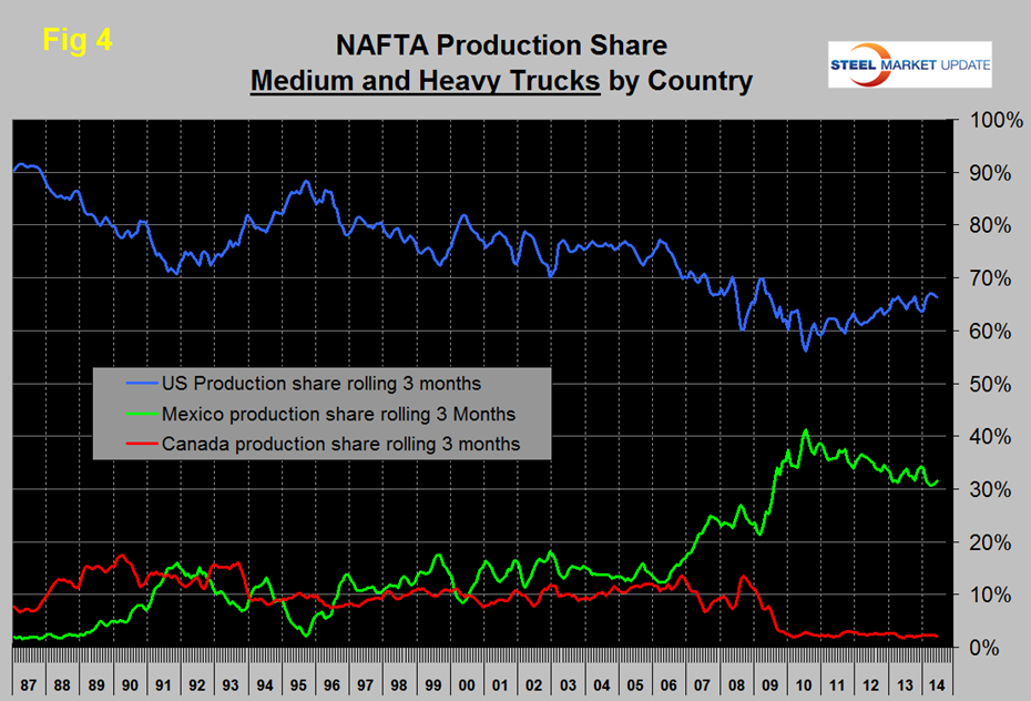 This turned around in the last three months in the US and Canada but not in Mexico. The production share trends for medium and heavy trucks is similar to light vehicles, (Figure 4). The US has been gaining share for four years at the expense of Mexico. Canada’s share has been flat since late 2009.