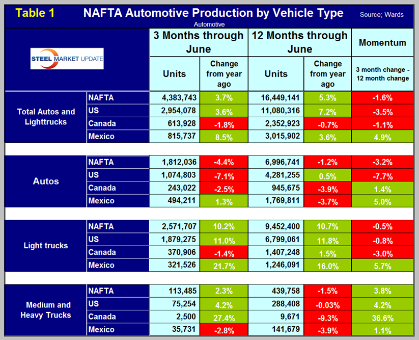 Total light vehicle production in NAFTA in June was at an annual rate of 17,575,000 units, down by 2.7% from May but still the third best month of the year. Medium and heavy truck production in June was at an annual rate of 470,000 units up from 447,000 units in May. On a rolling 12 months basis y/y light vehicle production in NAFTA increased by 5.3 percent and is now well above the pre-recession peak, (Figure 1).
