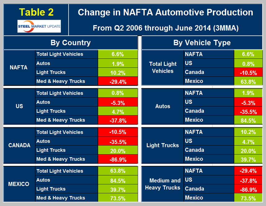 Total light vehicle production in NAFTA on a three month moving average basis is now 6.6 percent higher than it was in the pre-recessionary peak of Q2 2006, however there is a big difference between the recoveries of the three nations, (Table 2). The US is up by 0.8 percent, Canada is still down by 10.5 percent and Mexico is up by 63.8 percent.