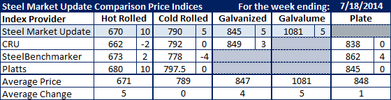 Steel Market Update watches a number of flat rolled steel indexes and once per week we provide our readers an analysis of what movement has occurred in each during the prior week. This week we found small movements, mostly indicating higher prices, in most of the indices. Hot rolled saw two indexes moving prices by $10 per ton (SMU and Platts) while CRU was down $2 and SteelBenchmarker was up $2 per ton. Our HRC price average of the indices followed was $671 per ton up $5 per ton from one week earlier.