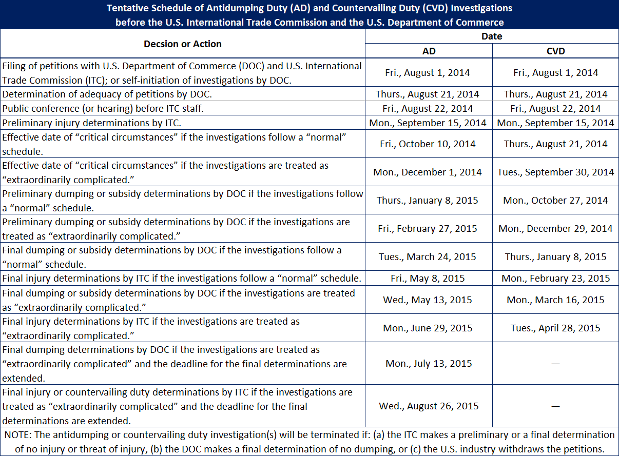 The following table is a mock-up of what one group believes the timeline could be if there were dumping suits filed on August 1, 2014. This is an example and not reality as there have been no suits filed on cold rolled or coated steels at this point in time.
