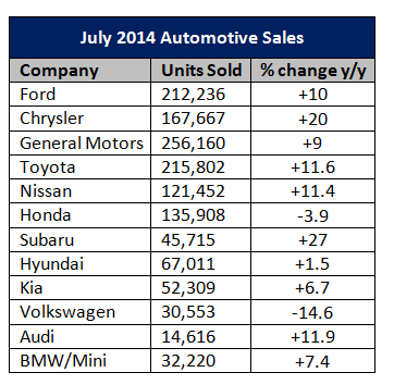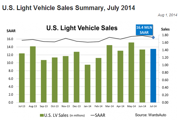 US automotive sales were hot in July with double digit increases for many automakers. WardsAuto estimates 1.43 million vehicles were delivered in July, a 9.1 percent over July 2013. The seasonally adjusted annual rate of 16.4 million came in lower than the consensus range forecast of 16.6 million to 17.2 million. Summer sales incentive helped boost sales.