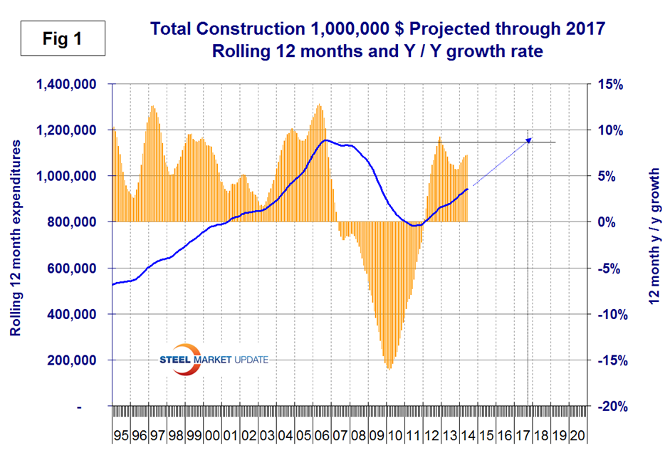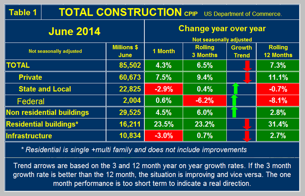 On a rolling three month basis total construction was up by 6.5 percent y/y and was up by 7.3 percent on a rolling 12 months y/y. This means that total construction growth is decelerating slightly since the short term growth (3 months) is less than the long term, (12 months). Note this is not a seasonal effect because our y/y analysis removes seasonality. Private work has negative momentum but state and local momentum was positive in the June results. We consider three sectors within total construction. These are non-residential, residential and infrastructure. On a rolling three month basis y/y non-residential is growing at 6.0 percent and accelerating. Residential is growing at 23.2 percent and slowing. Infrastructure grew 0.7 percent y/y and decelerated in the last three months compared to the rolling 12 month number. This was probably due to shenanigans on the Hill, see below. The growth of total construction has been fairly steady for over 18 months but it will be Q3 2017 before the pre recessionary peak is regained, (Figure 1). The pre-recession peak of total construction on a rolling 12 month basis was $1,145 B in 12 months through February 2007. The low point was $768 B in 12 months through May 2011. The 12 month total through the latest data of June 2014 was $943 B. This means that total construction is still only 82.3 percent of its pre-recession peak.