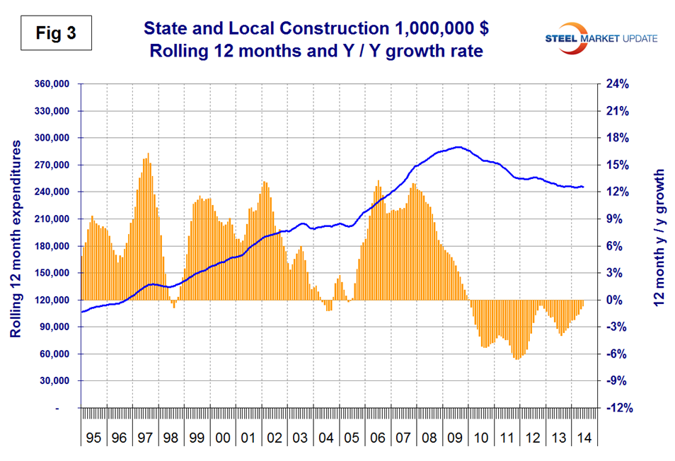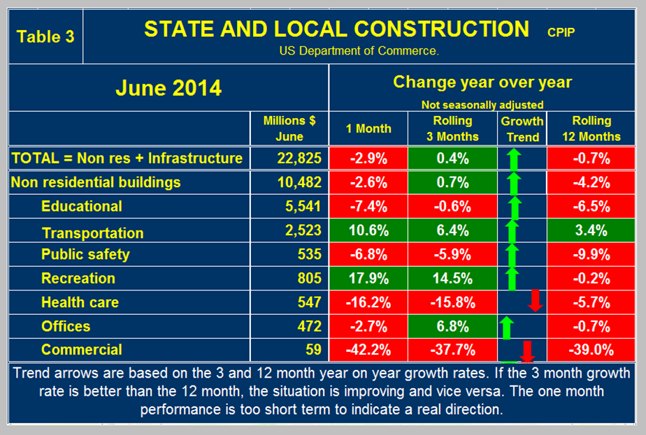 State and local Construction: S&L work contracted by 2.9 percent in the single month of June y/y and eked out a small gain of 0.4 percent in the rolling three months through June, (Table 3).