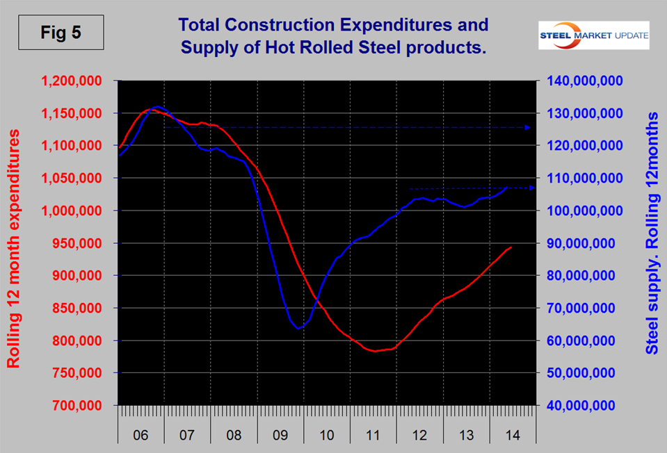 SMU Comment: Steel consumption is about eight million tons per year below where it should be at this stage of recovery from a recession. Manufacturing has pulled its weight but construction is still a drag. Figure 5 illustrates the magnitude of this effect.