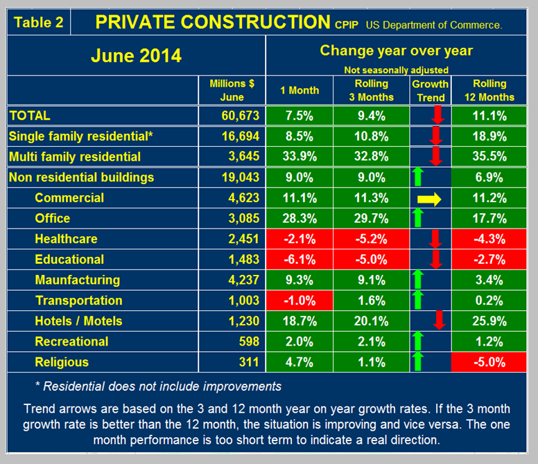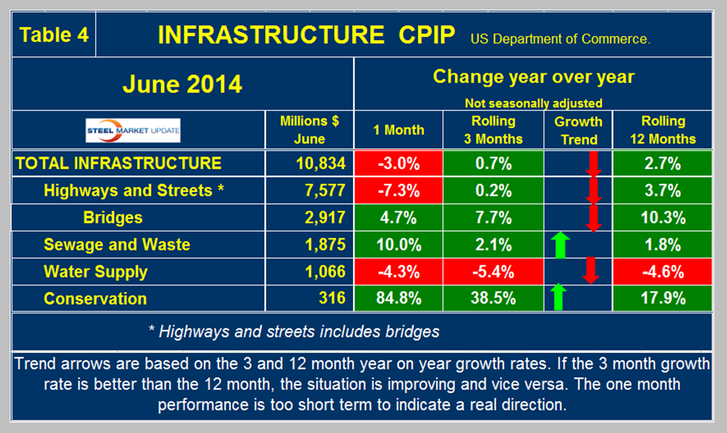 Infrastructure: Expenditures have had positive growth in each of the last ten months through June on a rolling 3 months basis with a + 0.7 percent result in the latest data. The growth in three months is slower than that in 12 months meaning that momentum slowed as the industry waited for the resolution of the highway trust fund issue. Bridge construction is still strong though slowing and is the bright spot in total highways and streets expenditures, (Table 4).