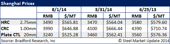 SMU was looking at domestic Chinese (Shanghai) cold rolled numbers that were part of a report produced by Charles Bradford or Bradford Research. The report cited Shanghai prices for .0397” (1.00 mm) cold rolled coils at $646.88 per metric ton. This equates to $586.84 per net ton FOB Shanghai, China. According to Mr. Bradford these prices include the 17 percent value added tax (VAT) which is collected in China.