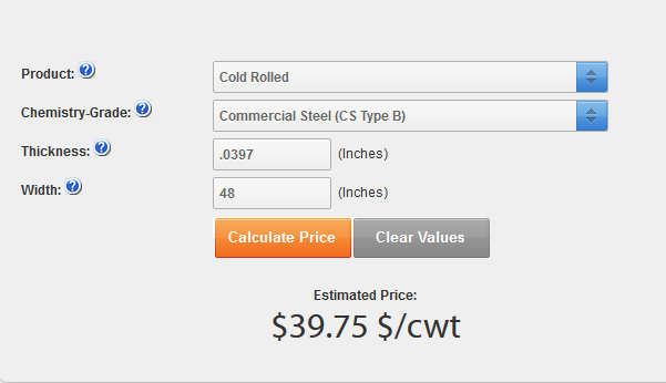 Using the SMU Price Estimator (which is a free tool on our website – see below) we calculated domestic cold rolled using the same parameters as our Chinese example and we came up with $39.75/cwt FOB Steel Mill East of the Rockies (prior to today’s changes in our cold rolled index).
