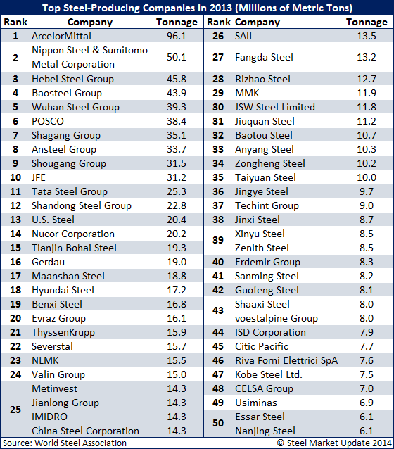 A recent report from the World Steel Association named the top 50 steel producing companies for 2013. ArcelorMittal was the worlds largest producer with 96.1 million metric tons of steel produced, followed by Nippon Steel & Sumitomo Metal Corporation producing 50.1 million tons. Third place, with 45.8 million tons, went to Hebei Steel Group, followed by Baosteel Group with 43.9 million tons and Wuhan Steel Group with 39.3 million tons. The remainder of the top 10 producers included POSCO, Shagang Group, Ansteel Group, Shougang Group, and JFE. No U.S. steel producers made the top ten.