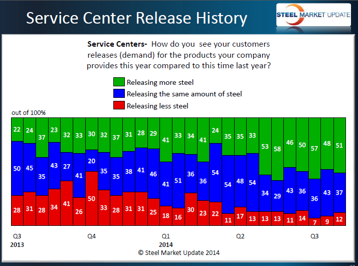 What we have been seeing out of the manufacturing companies since the beginning of April, is a steady improving trend of manufacturers reporting at higher and higher percentages that they are buying more steel than one year ago. Last week we found 43 percent of the manufacturing companies reporting that their company was buying more steel than one year ago. This is a 7 percent improvement over the past two weeks and a 28 percent increase since the first week of April 2014.
